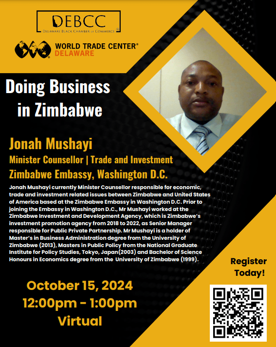 Join us for an exclusive webinar featuring Jonah Mushayi, Economist at the Ministry of Finance and Investment Promotion of Zimbabwe, as we explore the untapped opportunities in Zimbabwe's growing market. Learn about key sectors, investment prospects, and how DEBCC members can seamlessly engage with international business ventures. Don’t miss this chance to expand your business horizons and discover how you may already be poised for international success!