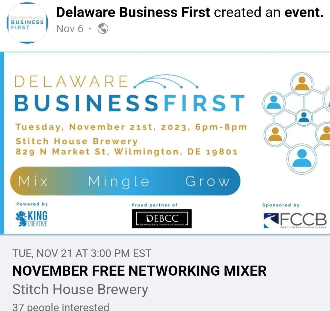 Come and join us as business owners meet at Stitch Brewery House in Wilmington to have fun, relax and make connections that can help your business. Sponsored by King Creative, First Citizens Community Bank and the Delaware Black Chamber of Commerce. This regular monthly event, Delaware Business First, starts at 6 pm and ends at 8 pm.Images