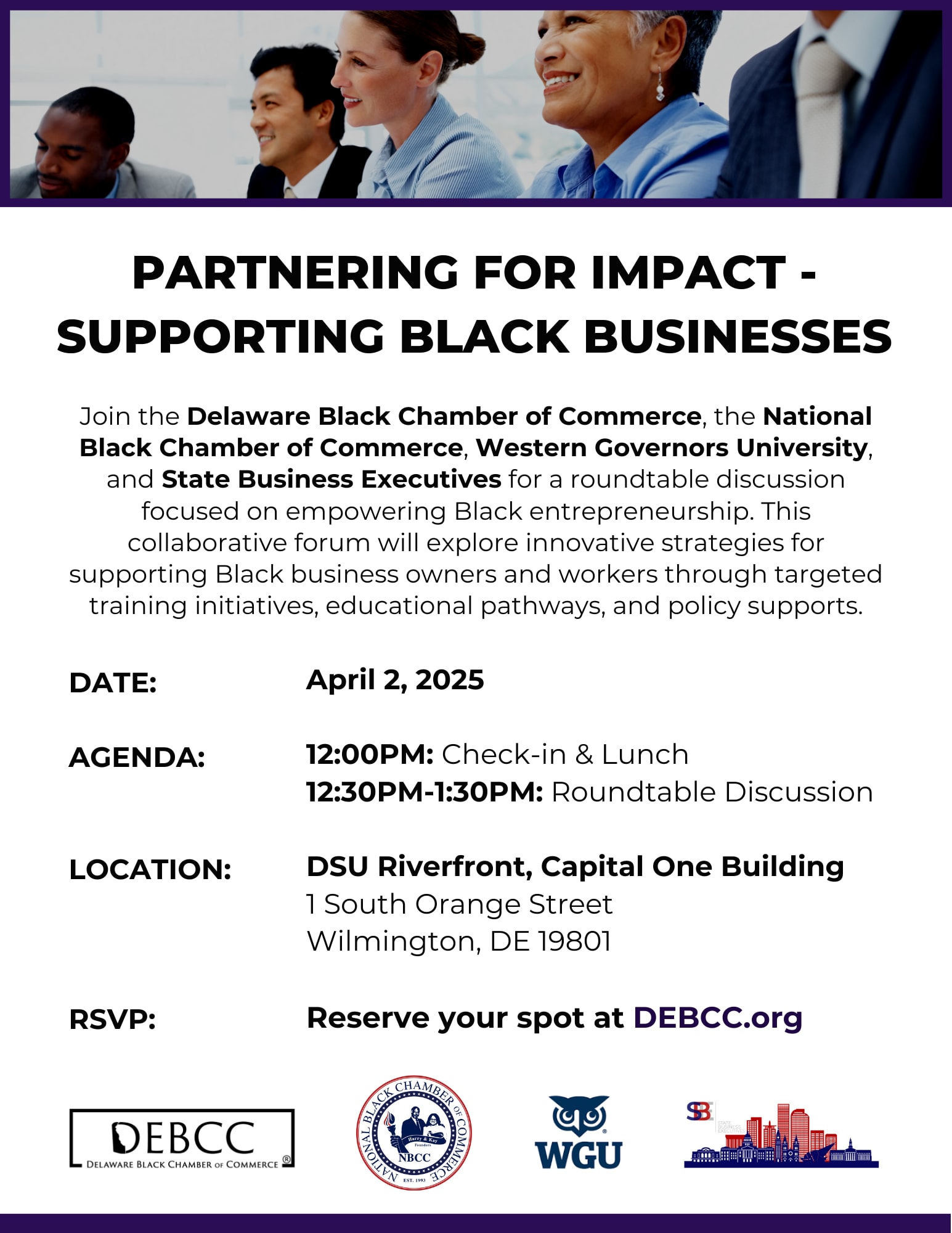 Join the Delaware Black Chamber of Commerce, the National Black Chamber of Commerce, Western Governors University, and State Business Executives for a roundtable discussion focused on empowering Black entrepreneurship. This collaborative forum will explore innovative strategies for supporting Black business owners and workers through targeted training initiatives, educational pathways, and policy supports