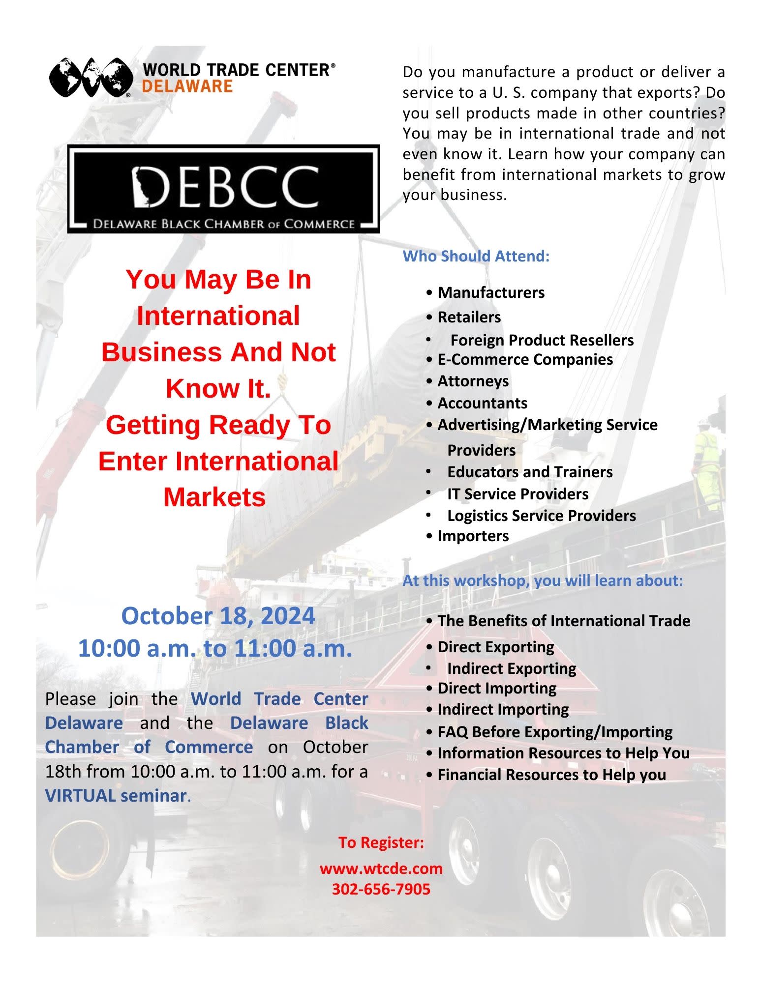 Do you manufacture a product or deliver a service to a U. S. company that exports? Do you sell products made in other countries? You may be in international trade and not even know it. Learn how your company can benefit from international markets to grow your business.Images